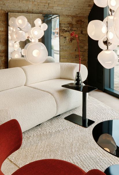 A curled bouclé fabric, Elle drapes and curves around furniture like an elegant designer coat. The spun bouclé yarn created by blending wool, viscose and acrylic gives the surface a soft tactility. During the subsequent dying the yarns take the colour differently, creating captivating shifts within the same tones. This effect and a slight sheen from the acrylic blend bring life to the voluminous textured bouclé surface. Elegant neutrals range from oyster, coffee, pearl white, light ivory and caramel to cactus green, concrete grey, nutmeg, mud brown and ink. Taking cues from fashion, brighter contrast colours are sunset orange, rust, plum and aqua.